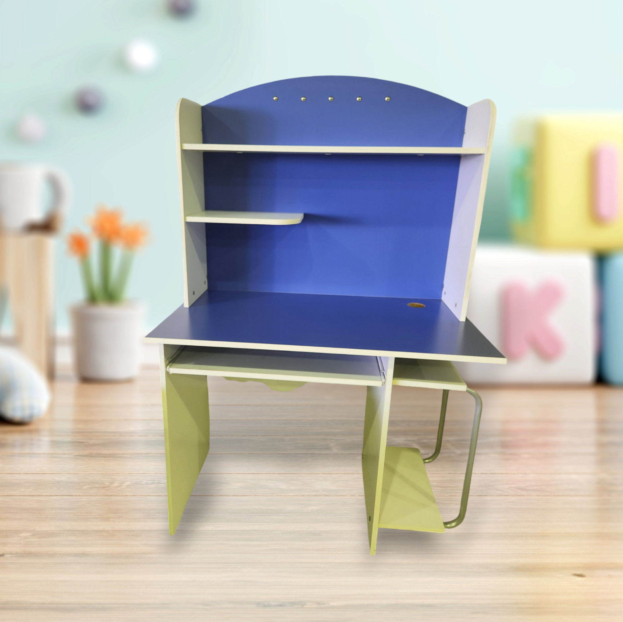 Παιδικό γραφείο ανθεκτικής μελαμίνης με ανοιχτή βιβλιοθήκη σε μπλε-λευκό χρώμα.
